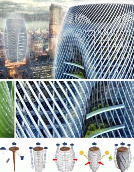 如何讓建筑在最大程度上收集雨水?H3AR設計的集雨摩天樓可能給出答案。借助于覆蓋整個外部的水槽網,雨水將直接流入一個處理廠。處理后獲得的生活用水可用于沖馬桶、洗衣服、其他清洗工作以及澆灌植物。根據H3AR的設計,摩天樓的皮膚與屋頂上一個巨大的碗狀雨水收集設施結合在一起,在最大程度上獲取雨水。    7.法國第戎多功能生態區