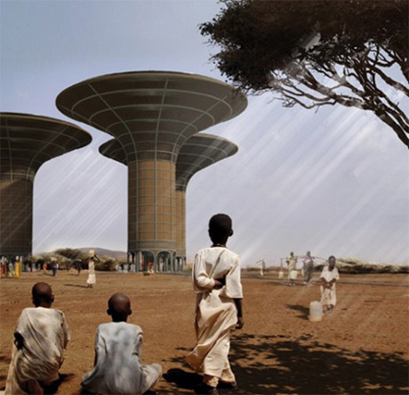 在面積廣闊的蘇丹沙漠,淡水成為最寶貴的資源之一,獲取淡水的難度超乎人們想象。有意思的是,沙漠地下深處也隱藏著世界上最大的地下湖,如果能夠有效加以利用,當地居民的生活便會發生翻天覆地的變化。波蘭建筑事務所H3AR提出了一種解決之道,即建造外形好似當地猴面包樹的水塔群并利用地下泵抽水。水塔內建有一個水處理廠、一所醫院、一所學校以及一個食物儲藏中心。