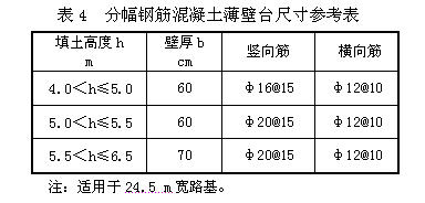 平原區(qū)填土高度h≤6.5 m的小橋,可采用薄壁臺,軟基段宜控制在6.0 m以下。現(xiàn)運營的高速路中有些薄壁臺出現(xiàn)開裂現(xiàn)象,設(shè)計時應(yīng)特別引起注意。