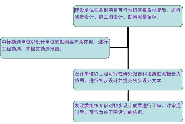 工程設計主要包括初步設計和施工圖設計。對于技術上復雜,又缺乏經(jīng)驗的項目,可以在初步設計和施工圖設計兩個階段間增加技術設計。對于小型并技術簡單的道路工程,經(jīng)有關部門同意后,可以利用方案設計代替初步設計,按方案設計審批后直接轉入施工圖設計。典型的流程圖如下: