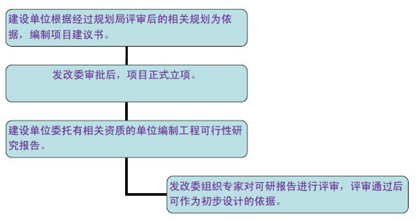市政工程設計的前期工作主要包括項目立項、預可行性研究和工程可行性研究。對已明確建設必要性的工程項目,前期工作可以直接進入工程可行性研究。典型的流程圖如下: