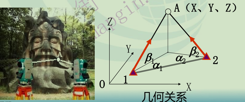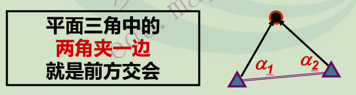 在測量中:前方交會是在兩個已知點1、2上,安置經緯儀,對未知點A測定水平角、垂直角,就能測得未知點坐標A(X、Y、Z)。