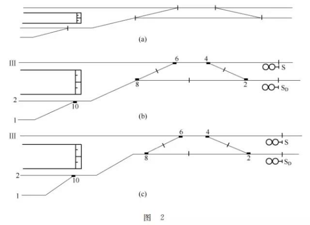 假若把信號平面布置圖畫成圖2(c)那樣就錯了,進2股道的線路雖然也彎了一 彎,但那只能認為是線路曲線,如按圖2(c)設計,會把2股道誤認為正線。