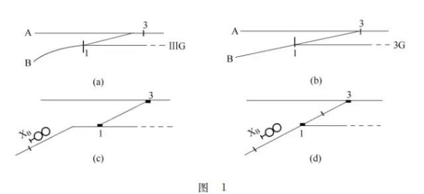 如圖1所示,(a)和(b)是1:2 000的線路平面圖。在圖1(a)中,l號道岔直向開通Ⅲ股道,所以Ⅲ股道是正線;信號平面布置圖的正確畫法如圖1(c)所示,既表達了B方向是支線的意思,又能明顯看出進Ⅲ股道是經1號道岔的直向,進站信號機XB可以顯示一個黃燈或綠燈。在圖1(b)中,1號道岔直向開通3號道岔之側向,其信號平面布置圖的正確畫法如圖1(d)所示,盡管1號道岔定位開向3股道,但能明顯看出1號道岔直向是連接3號道岔之側向,所以進站信號機XB應封閉綠燈,也沒有一個黃燈的顯示。
