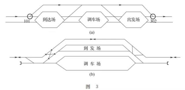 示意圖如圖3所示,圖3(a)中的通過外包線并非正線,《技規》第27條對正線的定 義是明確的,正線是指連接車站并貫穿或直股伸入車站的線路。盡管圖3(a)中101和302號道岔可能都采用18號轍叉的道岔,但接入通過外包線的列車仍然按進側線處 理,進站信號機顯示兩個黃燈,外包線上的進路信號機無綠燈顯示。