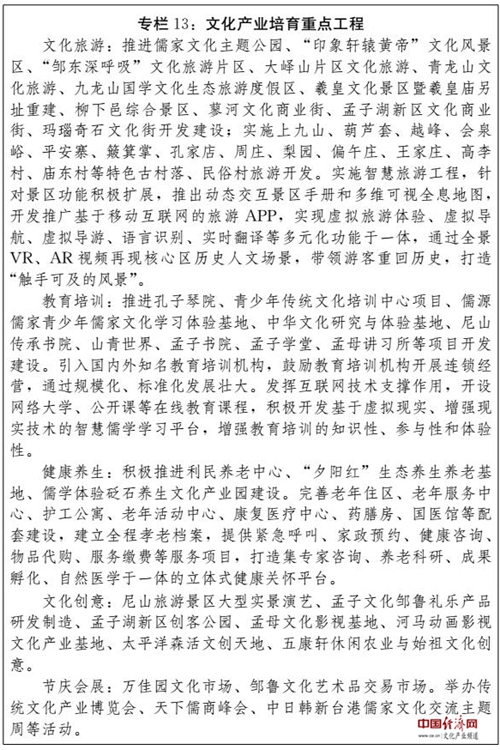 (四)建設(shè)全國(guó)文化經(jīng)濟(jì)融合發(fā)展示范區(qū)。充分發(fā)揮文化引領(lǐng)、滲透和支撐作用,系統(tǒng)推進(jìn)文化資源開(kāi)發(fā),強(qiáng)化文化品牌載體功能,推進(jìn)文化與相關(guān)產(chǎn)業(yè)深度融合,大力發(fā)展文化產(chǎn)業(yè),提升文化產(chǎn)業(yè)園區(qū)、特色基地建設(shè)水平,在更高層次上打造享譽(yù)國(guó)內(nèi)外、彰顯儒家文化永恒魅力的旅游休閑圣地、教育培訓(xùn)基地、健康養(yǎng)生福地和文化創(chuàng)意高地。