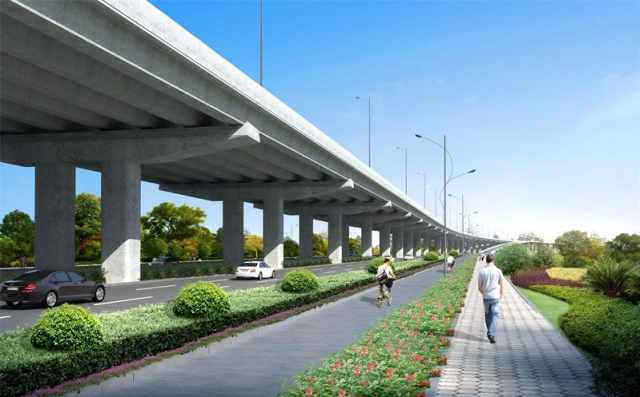該快速路主線與鏡水路立交銜接,采用高架形式自西向東先后跨越大越路、綠云路、解放路、中興大道、越東路,二期工程延伸至越興路。 另外, 保留現(xiàn)狀鏡水路立交、大越路輔道立交,并新增綠云路和越東路2處全互通立交,沿線設(shè)置6對(duì)上下坡匝道與地面道路銜接。