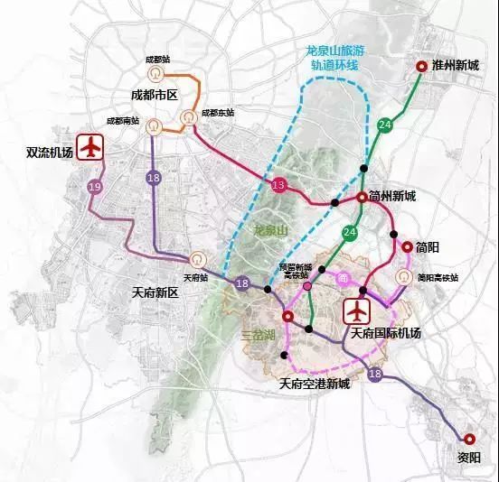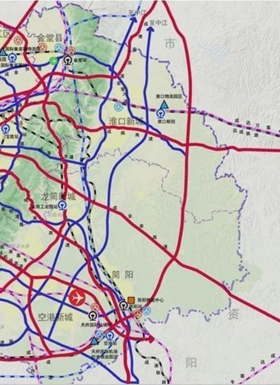依托既有成渝鐵路、達(dá)成鐵路和規(guī)劃貨運(yùn)外繞線,連接青白江國際鐵路港,融入 “ 蓉歐+ ” 。淮州新城預(yù)留國際鐵路港功能。規(guī)劃建設(shè)蓉昆高鐵成自段、成達(dá)萬高鐵等7條出川高鐵,融入國家高鐵網(wǎng)絡(luò)。推動(dòng)成渝客專、遂成鐵路和蓉昆高鐵成自段等鐵路公交化運(yùn)營,強(qiáng)化區(qū)域協(xié)作。依托18號線、13號線等軌道快線,實(shí)現(xiàn)中心城區(qū)和東部城市新區(qū) “ 半小時(shí) ” 到達(dá)機(jī)場。