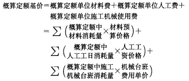 采用擴(kuò)大單價(jià)法編制概算,首先應(yīng)根據(jù)概算定額編制擴(kuò)大單位估價(jià)表(概算定額基礎(chǔ)價(jià))。概算定額是按一定計(jì)算單位規(guī)定的、擴(kuò)大分部分項(xiàng)工程或擴(kuò)大結(jié)構(gòu)部門的勞動(dòng)、材料和機(jī)械臺(tái)班的消耗量標(biāo)準(zhǔn)。擴(kuò)大單位估價(jià)表是確定單位工程中各擴(kuò)大分部分項(xiàng)工程或完整的結(jié)構(gòu)所需全部材料費(fèi)、人工費(fèi)、施工機(jī)械使用費(fèi)之和的文件。計(jì)算公式為: