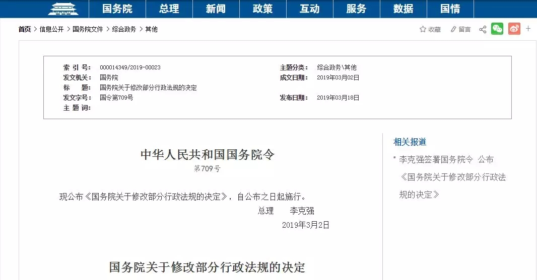 2019年3月18日,中國國務(wù)院總理李克強簽署國務(wù)院令,公布《國務(wù)院關(guān)于修改部分行政法規(guī)的決定》(以下簡稱《決定》),自公布之日起施行。