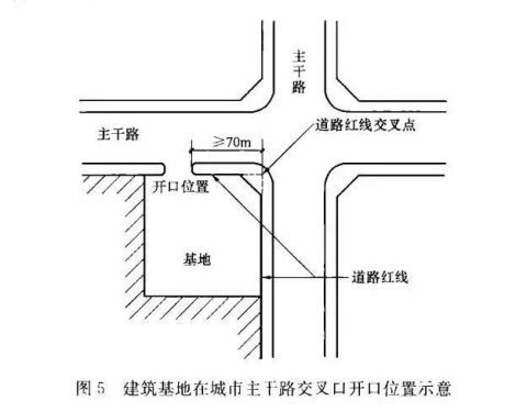 中等城市、大城市的主干路交叉口,自道路紅線交叉點起沿線70.0m范圍內(nèi)不應設置機動車出入口。