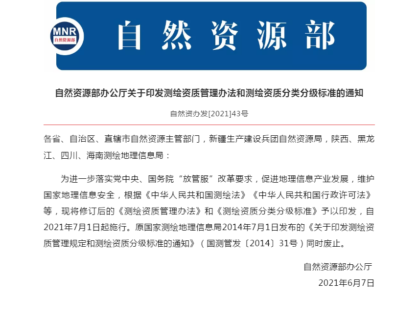 修訂版《測繪資質(zhì)管理辦法》和《測繪資質(zhì)分類分級標(biāo)準(zhǔn)》自2021年7月1日起施行