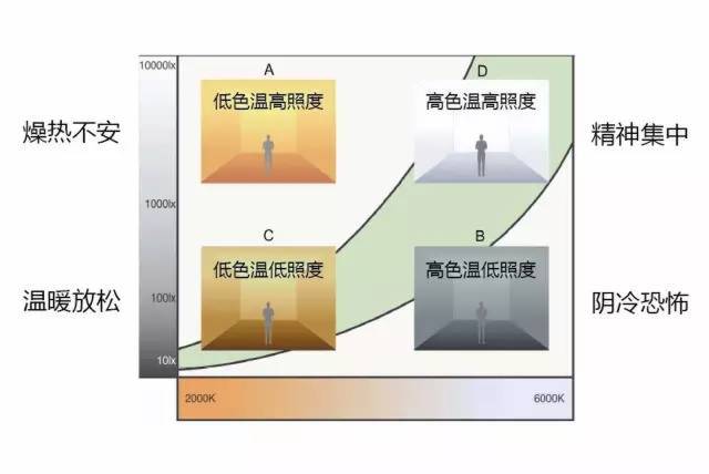 人對色溫的喜好還與照度水平有相應的關系,不同的色溫及照度組合,會通過人的視覺令人產生不同的精神狀態及心理感受,所以色溫及照度組合的正確選擇是決定整個環境舒適度的基礎。下圖給出了不同照度水平下不 同色溫所產生的不同印象: