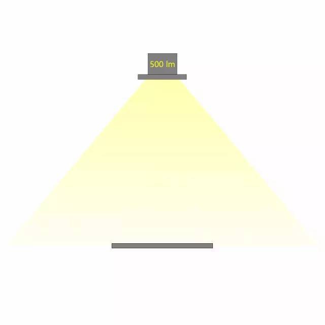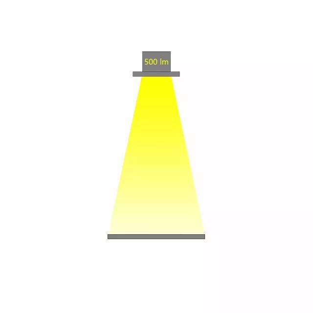 相同光通量的燈具,不同的配光角度,在相同的距離照射到同一個平面,所產生的照度是不同的。配光角度越大,相同距離的照度越小。如下圖,燈具的光通量為500lx,當配光角度不同時,相應的照度也會不同。