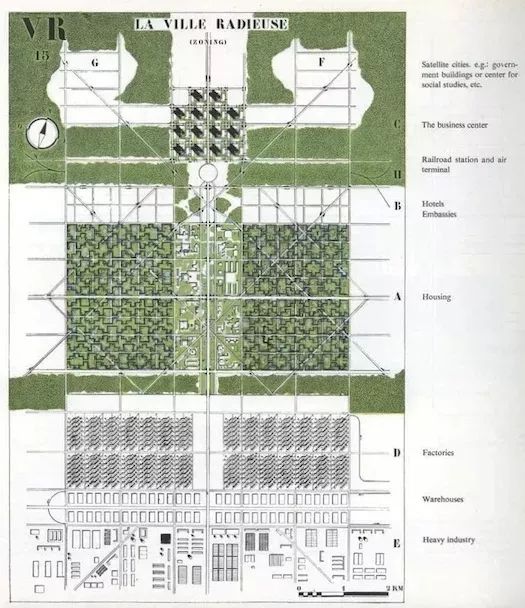 他的方案,也被稱為“公園中的塔”,名副其實:無數(shù)的高層建筑,每一個都被綠色空間包圍。每一棟建筑都被規(guī)劃師戲稱為“超級街區(qū)”,空間被清晰地劃分為不同的用途(在上圖中包括“住宅”、“商業(yè)中心”、“工廠”和“倉庫”)。