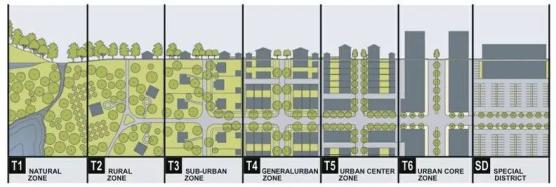 城市斷面圖被規(guī)劃人員作為劃分景觀層次的一種可視化多用途工具。這幅由建筑師安德雷斯·杜安伊創(chuàng)作的特別的作品,展示了自然和密集的城市區(qū)域之間的鄉(xiāng)村到城市的漸變,這已經(jīng)成為新城市主義者的一個流行架構(gòu)。