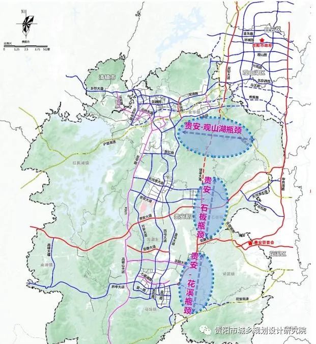 規(guī)劃區(qū)內(nèi)匯集3條高速公路、2條快速路、7條主干道,骨架道路基本建成,但版塊之間銜接不足,形成貴安—觀山湖、貴安—石板、貴安—花溪3處交通瓶頸。