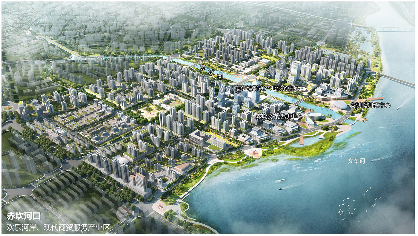 沿文車河、赤坎河河岸布置三大明星項目:打造湛江灣影視產業服務中心,擴大赤坎影視文化影響力;擴建湛江賽艇皮劃艇基地,打造1. 6萬㎡省級皮劃艇訓練中心,承接賽事的訓練和舉辦;濱河建設2.5萬㎡區級文化活動中心。
