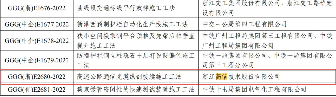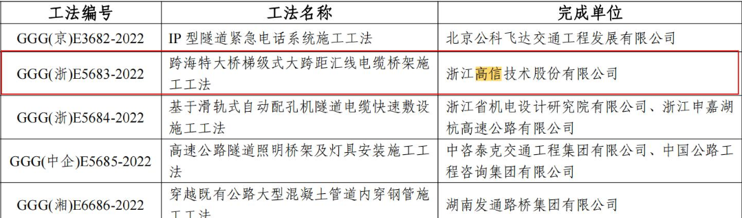 近日,中國公路建設行業協會公布了2022年度公路工程工法評審結果,浙江交通集團高信公司申報的《高速公路通信光纜縱剖接續施工工法》、《跨海特大橋梯級式大跨距匯線電纜橋架施工工法》兩項工法通過評審,首次獲得部級工法的評定。