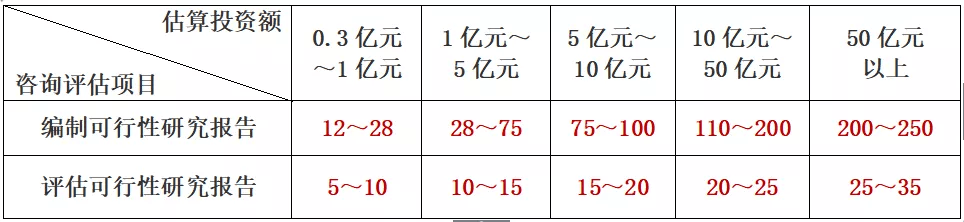 方法1:按建設(shè)項目估算投資額,分檔計算可行性研究報告編制和評估的咨詢服務(wù)費用(詳見表1),并由工程咨詢機構(gòu)和委托單位根據(jù)各類項目復(fù)雜程度協(xié)商確定具體調(diào)整系數(shù)(詳見表2)