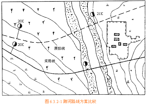 時(shí))或河溝過于彎曲的情況,可采取改河措施或改移路線,調(diào)整橋軸線與流向的夾角,以免過分增加施工困難和加大工程投資,選線時(shí)應(yīng)全面比較確定。