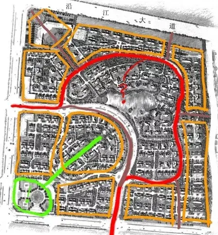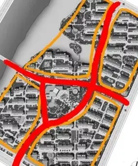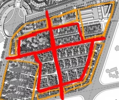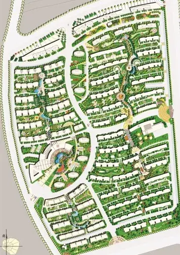 用地中間做環(huán)形道路,向外引出錯(cuò)落的分支道路,形成各自獨(dú)立的組團(tuán),中心適宜做景觀。