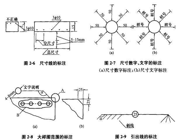(4)尺寸線必須與被標注長度平行,不應超出尺寸界線,任何其他圖線均不得作為尺寸線。在任何情況下,圖線不得穿過尺寸數字。相互平行的尺寸線應從被標注的圖形輪廓線由近向遠排列,平行尺寸線間的間距可在5-15mm之問。分尺寸線應離輪廓線近,總尺寸線應離輪廓線遠(圖2-6)。