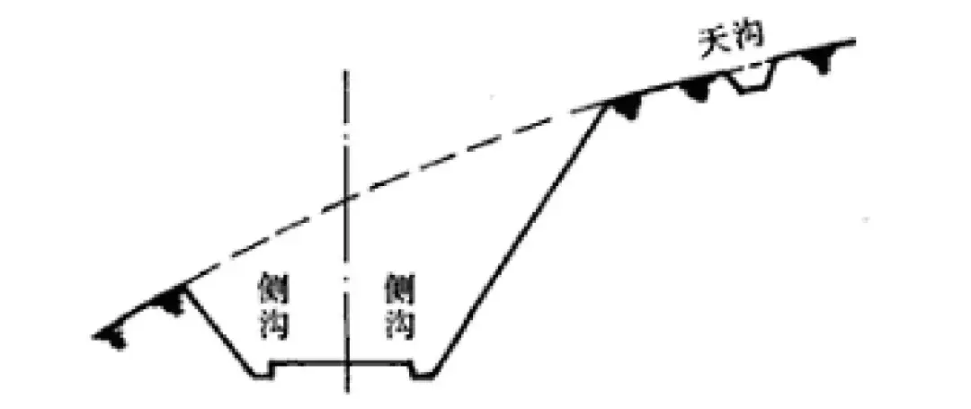 天溝設于路塹塹頂,用以排除山坡迎水方向流向路塹的地面水。路塹頂部無棄土堆時,天溝內邊緣至塹頂距離不宜小于5m;當溝內進行加固防滲時不應小于2m。