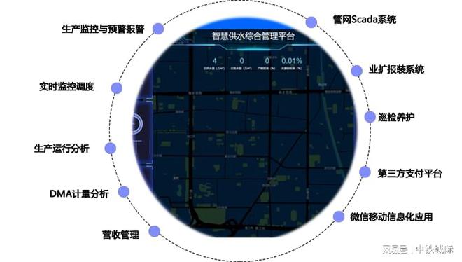 中鐵城際智慧供水平臺介紹平臺運用BIM、GIS、IOT(分布式系統(tǒng)、大數(shù)據(jù)分析、GIS查詢與服務、大屏數(shù)據(jù)可視化)等新一代信息技術與水務業(yè)務深度融合,通過充分挖掘數(shù)據(jù)價值,統(tǒng)網(wǎng)管控消除信息孤島,監(jiān)測收集—建模分析—智能預警—應對策略,構建城市水務物聯(lián)網(wǎng)、城市統(tǒng)管一張圖,保障水務設施安全、高效、科學運行。