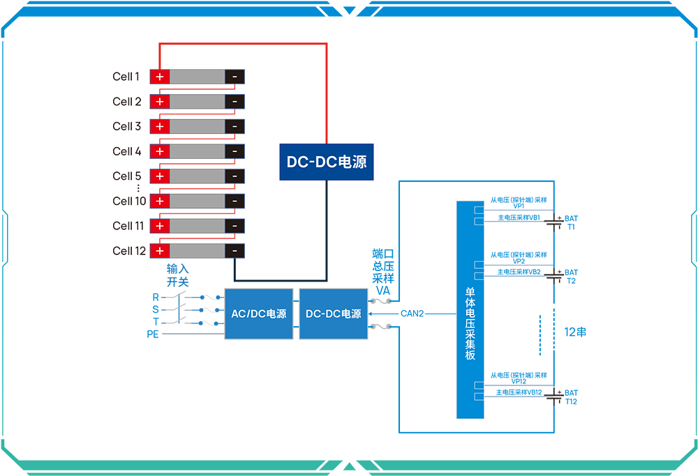 以圖為例,12個(gè)電池一串(可按16一串,建議最多不超過一個(gè)托盤數(shù)量為一串的方案),無需旁路切換板,采取整串同時(shí)充電的控制方式。