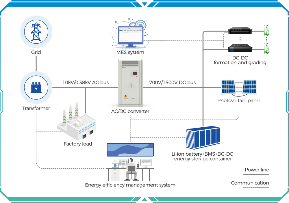 AC/DC變換器、儲(chǔ)能集裝箱、DC-DC化成分容通過700V/1500V直流母線耦合電氣連接;廠區(qū)能量可由EMS能量管理系統(tǒng)實(shí)時(shí)調(diào)度。