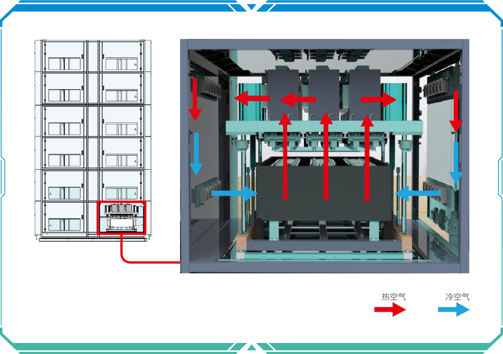 庫位內(nèi)集成了容量電源和容量針床,溫度由空調(diào)水冷卻方案控制。