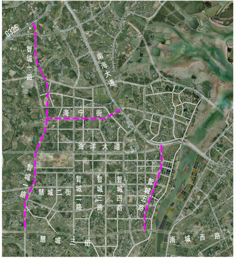 本次設計包括智城一路、智城五路、海寧街三條市政道路。智城一路為高地智慧城內(nèi)南北走向的城市主干路,南起慧城三街,北至325國道,路線全長5198.815m,紅線寬度40m,設計速度60km/h。智城五路為高地智慧城內(nèi)南北走向的城市次干路,南起慧城三街,北至南海大道,路線全長2158.647m,紅線寬度36m,設計速度50km/h。海寧街為高地智慧城內(nèi)東西走向的城市次干路,西起智城一路,東至南海大道,路線全長1862.438m,紅線寬度36m,設計速度40km/h。道路沿線主要為村莊及待開發(fā)用地,道路用地主要包括農(nóng)民的居住用地、耕地、菜地、苗圃、山丘、林地和魚蝦塘等等,局部地段有嶺地、河流、石化管線及高壓線穿過,既有建筑物較多,類型包括民宅、祠堂、學校等,且與G325、S280、海洋大道及多條村道等既有道路存在多次交叉。